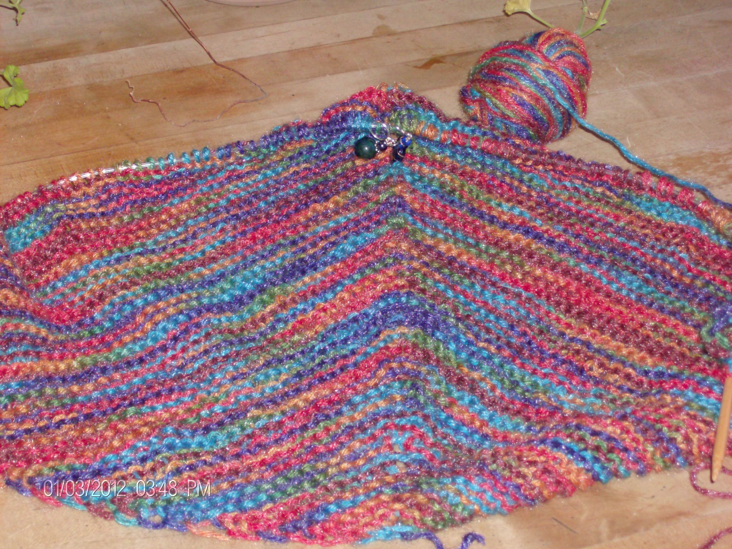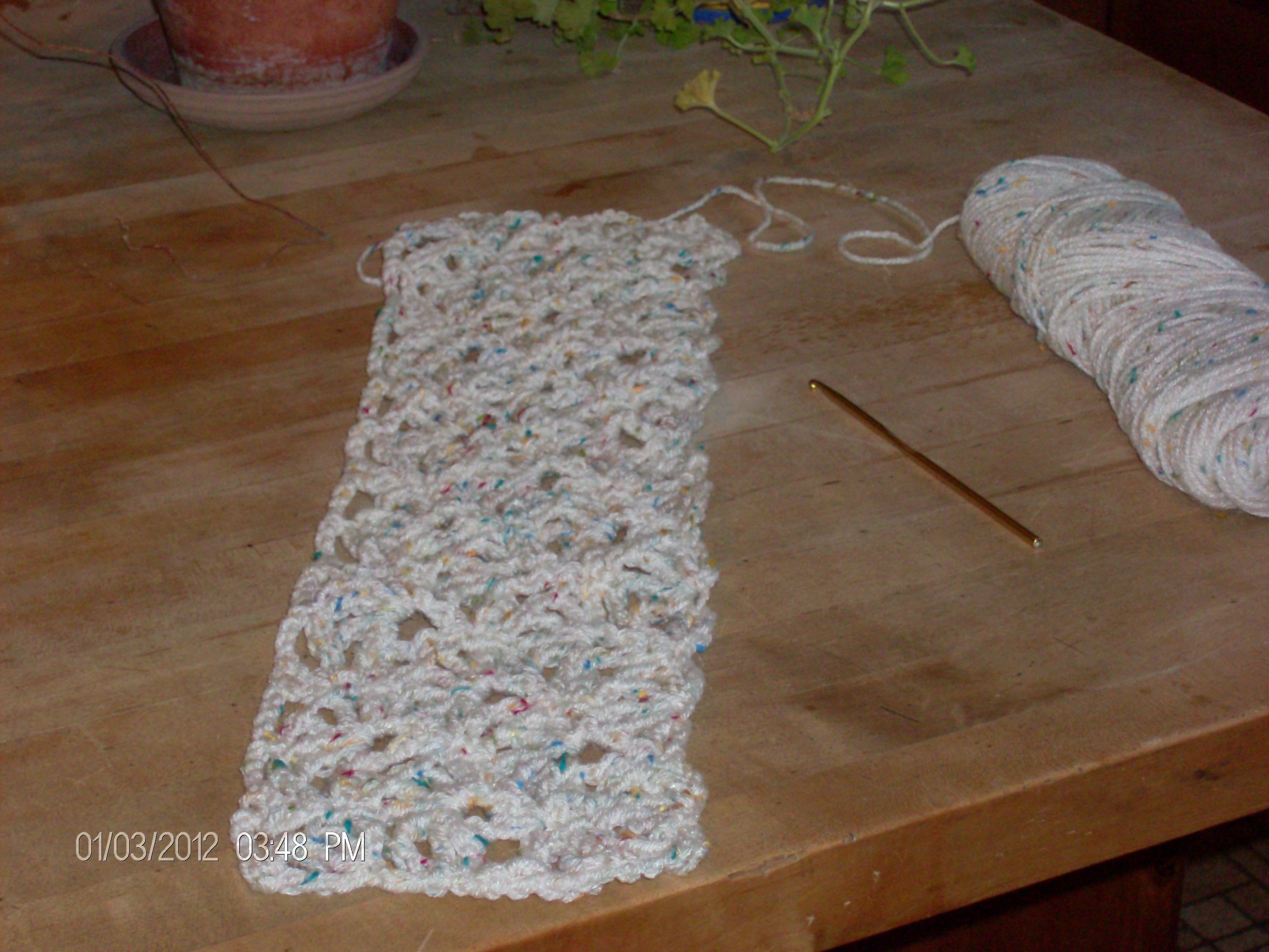 I hadn’t realized until a conversation today that I had made it into the new year with no Works In Progress from last year! This, I believe, is a new record for me. If you are anything like me you have several projects going at once and I suppose that makes sense. Sometimes you just have to change the item you are working on whether it’s because of yarn color (dark is very tiring on the eyes), stitch (complicated takes so much more brain power), or boredom (once in a while you just have to do something different – yarn, stitch, craft.) Now since the first of the year, and yes I know it’s only been 4 days since the first of the month, I have an assortment of things going on. I’ve started a crocheted rag rug out of the left over bits of Sugar ‘n’ Cream cotton yarn I’ve amassed. I’m just tying it all together and crocheting ’til I run out. Then it will find a basket to live in until I make more things in cotton thereby creating more bits and pieces. Believe it or not, this actually makes me feel somewhat organized.