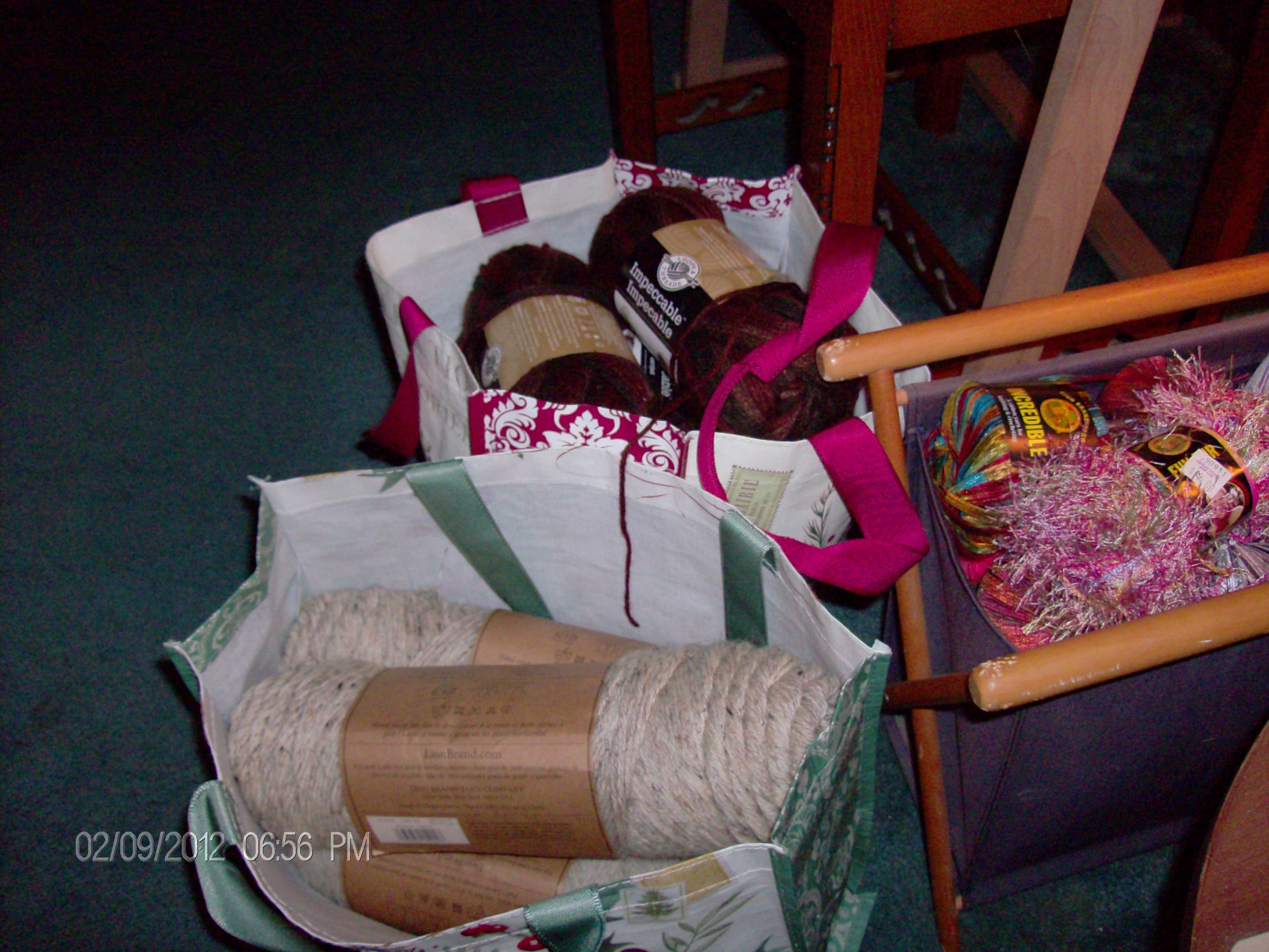 On Tuesday I went to Michaels in Avon to cash in a gift card I got for Christmas from a dear friend. Lion Brand Homespun was on sale and I’ve been promising myself a sweater for the past couple of years. I want a working sweater, one that I can throw in the washer and dryer so Homespun was looking good to me. I got the amount I needed in Quartz, a pretty beige/rose/purple combo that will be lovely in the roomy turtleneck sweater I’ve planned. Now, I couldn’t just buy the yarn I went there to get so I got 2 Fisherman’s Wool in Oatmeal and 2 in Birch Tweed. I see a couple of nice warm shawls coming from these. There was a Tuesday Special on Loops & Threads Impeccable which I got in Earth to make another Crossed Shawl and finally I got the last skein of Caron Simply Soft that I needed in Bone to finish the All Buttoned Up shawl from Austentatious Crochet. Oh, and I got the matching cotton for the last set of dish towels I bought so that I can get them into my studio. I really am shameless. How are you with your craft purchases???