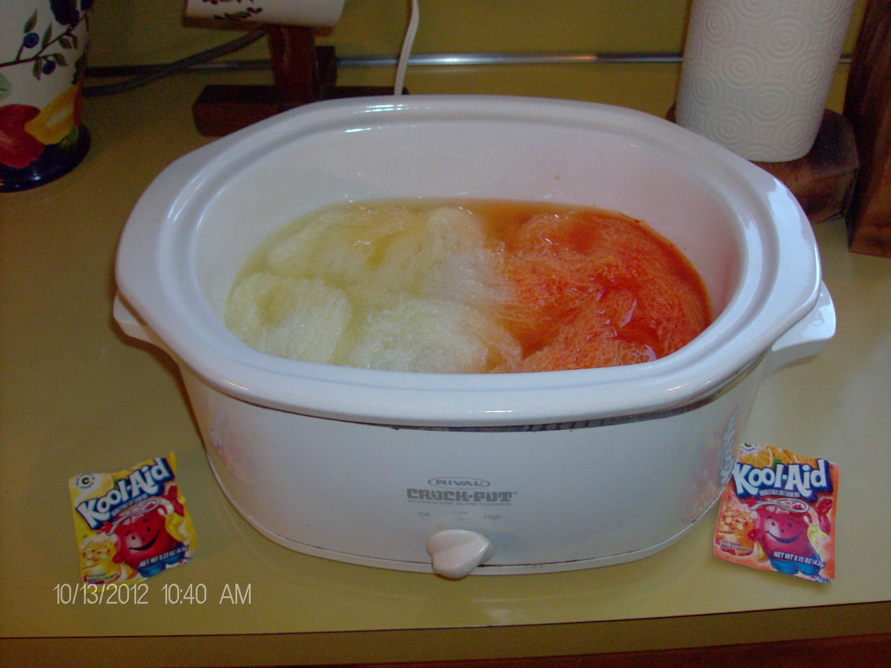 So I started out with a skein of the white boucle yarn that I dyed yellow and placed it into the crock pot I bought at the thrift shop specifically for yarn dyeing. The directions I had read to fill the crock pot 3/4 full of water, but I only went a little over half. I wasn’t confident enough that it wouldn’t wash out the dye altogether. Then I sprinkled a packet of Lemonade Kool-Aid on one side of the pot and a packet of Orange Kool-Aid on the other side of the pot. I then left it to perk for about an hour and a half on high to the most amazing results.