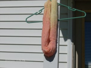 Okay, I have to admit now that I am well and truly hooked on this dyeing thing. I lust after white yarns in different weights with which to experiment. I plan to harvest my red cabbage leaves this weekend and use up my red onion peels on another few skeins of yarn, but I really can’t wait to get more Kool-Aid and go for more intense colors. Really, it’s just way too much fun.