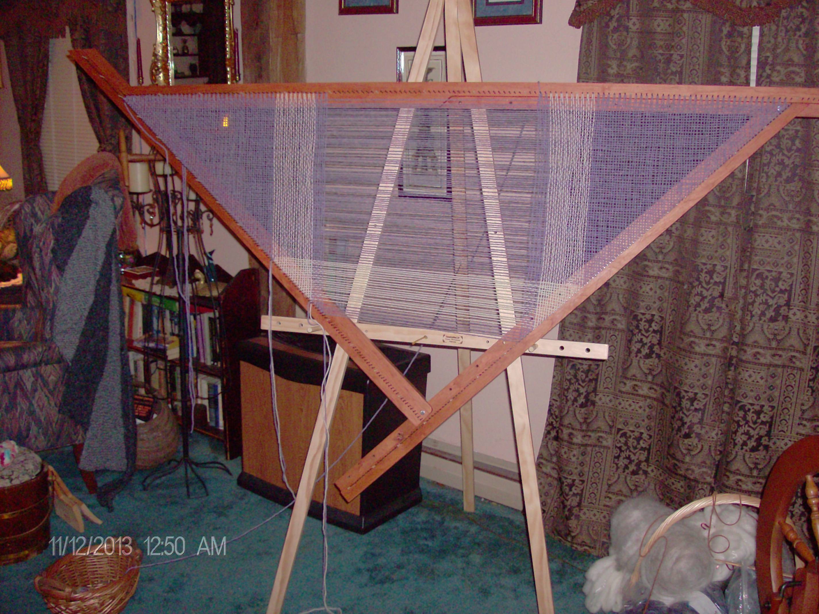 I am entranced with my new 7′ adjustable triangle loom. I have one shawl on it finished, but I haven’t had time to take it off the loom. I did the Vo-Ag craft show and have gotten enough orders that I haven’t had time to play with it. I’m not complaining  about the orders, just can’t wait for Christmas break so that I can really get creative with the new toy. I bought it because it will work very well with my not entirely consistent hand spun yarns so I now have more incentive to spin…when I get the time. Now if I can just squeeze out a little more time in my day…..