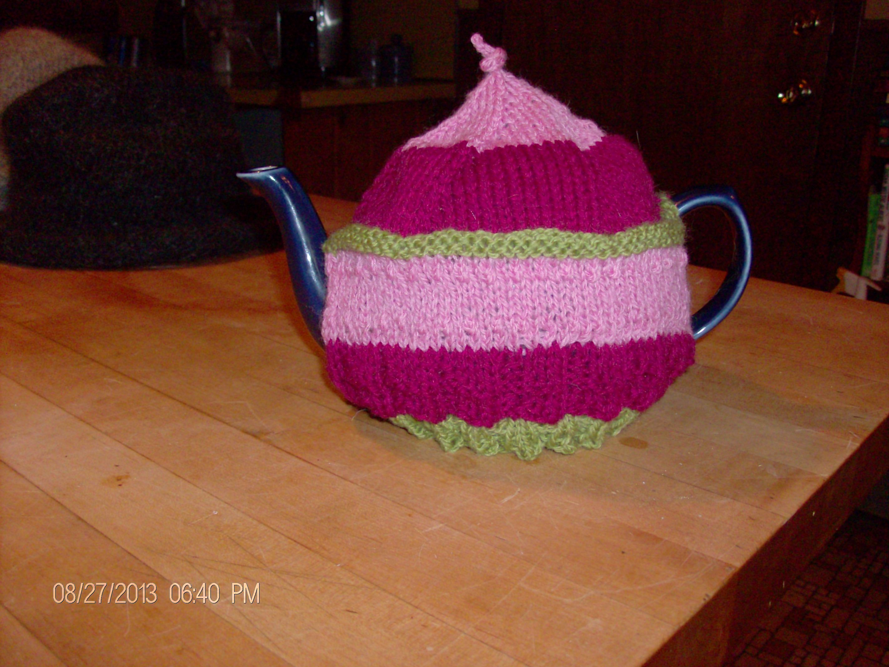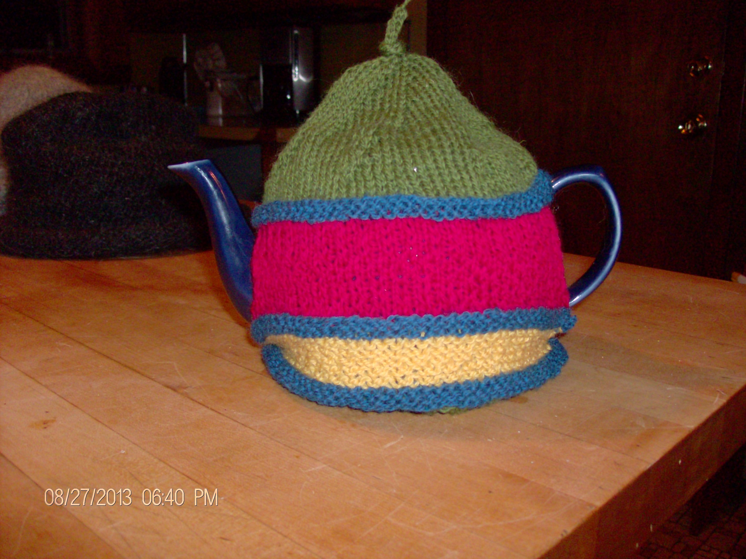 I’m steadily working on filling orders and replacing stock for the shows later this year when cold weather items will be a hit, but I really want to try some new patterns and ideas out. Tea cozies are my latest love. With a circa 1970 pattern book, a wicker tray of Palette yarns from Knitpicks, and my size 6 needles I’ve been having a grand time making up cozies out of swatches. This system appeals to my thrifty nature…I’m trying out new stitches in small sizes, but not wasting time by making them because they become a rather cute and useful finished item when done.